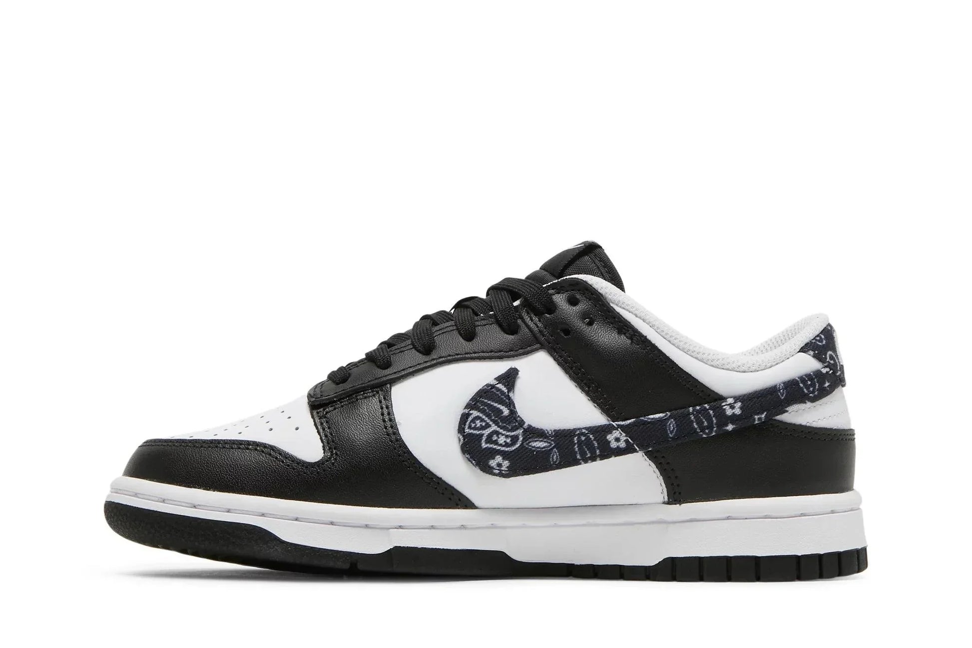 The black and white "panda" look has been a widespread hit with the Dunk's ever-growing audience, but how about a little twist? Typically, simple styles reign supreme in this mid-80s basketball shoe, but something about the bandana paisley print convinces even the most discerning footwear fashionistas. Scheduled for release on 12/31 at atmos Japan and later in 2022 at global retailers, the Nike Dunk Low "Paisley," which we've already shown you in green and blue, will be available in this clean two-tone black and white cut. The main differences from the popular "Panda" pair are that the tongue here is black, the inner lining is white, and of course, the paisley pattern is on the Swoosh logo and heel tab.